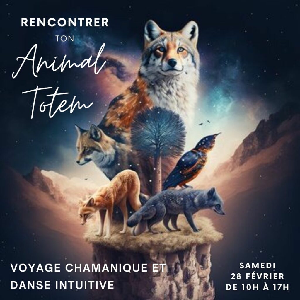 Le samedi 28 février, de 10h à 17h – Stage d’une journée «Rencontrer ton animal totem: Voyage chamanique et Danse intuitive». Une co-création avec Sophie Grandjean – art-thérapeute, hypnothérapeute, soins chamaniques, psychogénéalogie et EMDR. Lieu: Maison des Association de Doussard 74210. Tarif 100€