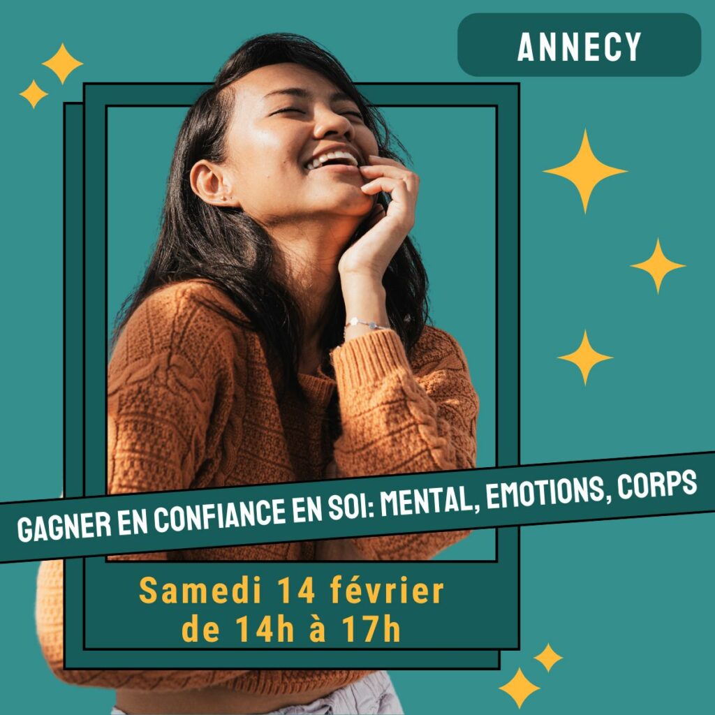 Le samedi 14 février, de 14h à 17h – «Gagner en confiance en soi: Alliance de l’intelligence émotionnelle et corporelle». Une co-création avec Sandrine GALOUX, coach spécialisée en intelligence émotionnelle, formatrice et consultante RH. Lieu: Espace Daléas, salle No 3, 2 Rue Louis Chaumontel, Annecy. Tarif 50€